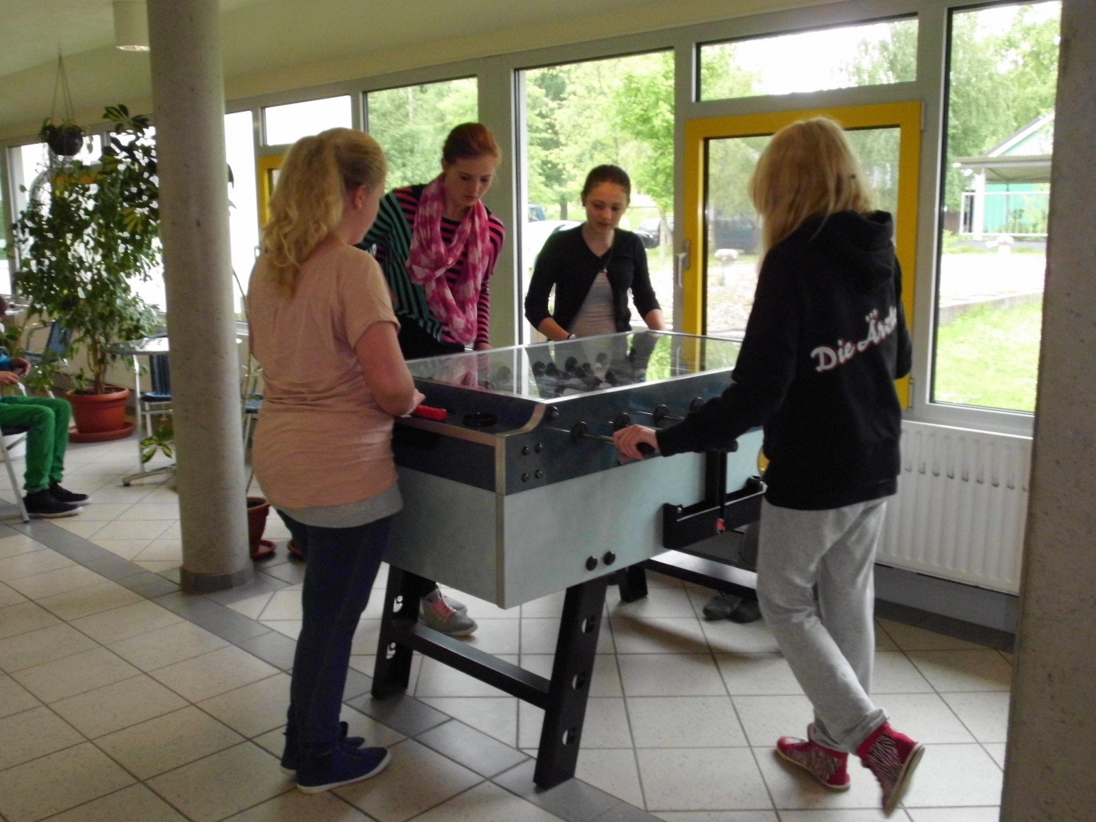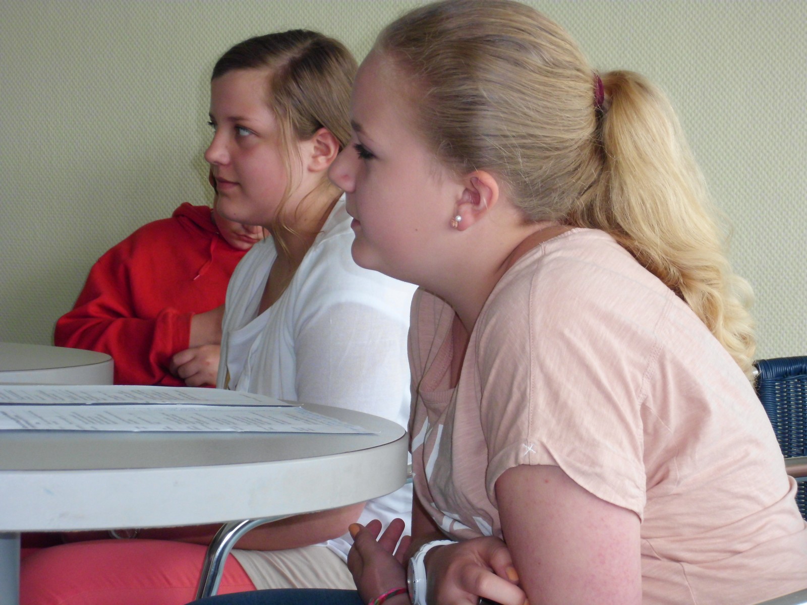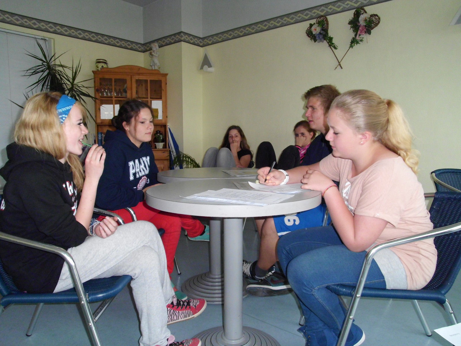 Vom 8. auf den 9. Juni haben sich die angehenden Konfliktlotsen mit Frau Tuchs und Frau Peters in der Jugendherberge Borgwedel getroffen, um sich weiter zu Konfliktlotsen ausbilden zu lassen. Im Vordergrund stand das Einüben der Mediationsgespräche, in denen immer zwei Schüler vorgaben, einen Streit zu haben, während zwei weitere Schüler versuchten, als Konfliktlotsen zu helfen, zu einer Einigung zu kommen. Die Anderen beobachteten die Gespräche genau, um anschließend Rückmeldungen über Gelungenes zu geben und Veränderungsvorschläge zu machen. Die Streitenden machten es den Konfliktlotsen dabei manches Mal sehr schwer, so dass diese nachher souverän bei echten Konflikten helfen können. Neben dem Einüben der Phasen wurden einige Gruppenspiele gespielt und es musste theoretischer Hintergrund gelernt werden. Natürlich gab es auch freie Zeit, die an diesem schönen Ort genossen wurde. Die Jugendherberge liegt direkt an der Schlei, von unseren Tagungsräumen hatten wir einen direkten Blick darauf, was manchmal allerdings ablenkte. Am Schluss sagten einige Schüler, dass es fast schade war, dass es hier so schön ist, weil sehr viel gearbeitet werden musste. In der Abschlussrunde fielen oft die Worte „cool“ und „Spaß“; einer meinte, es sei nicht so schlimm wie gedacht gewesen, eine andere sagte, es sei schön, dass sich alle so gut verstanden hätten. Und gelernt hätten sie auch eine ganze Menge. Noch ein Pluspunkt für die Jugendherberge: Es hat keiner über das Essen gemeckert!!! Die Mahlzeiten waren liebevoll zubereitet und es gab immer sehr viel Auswahl.